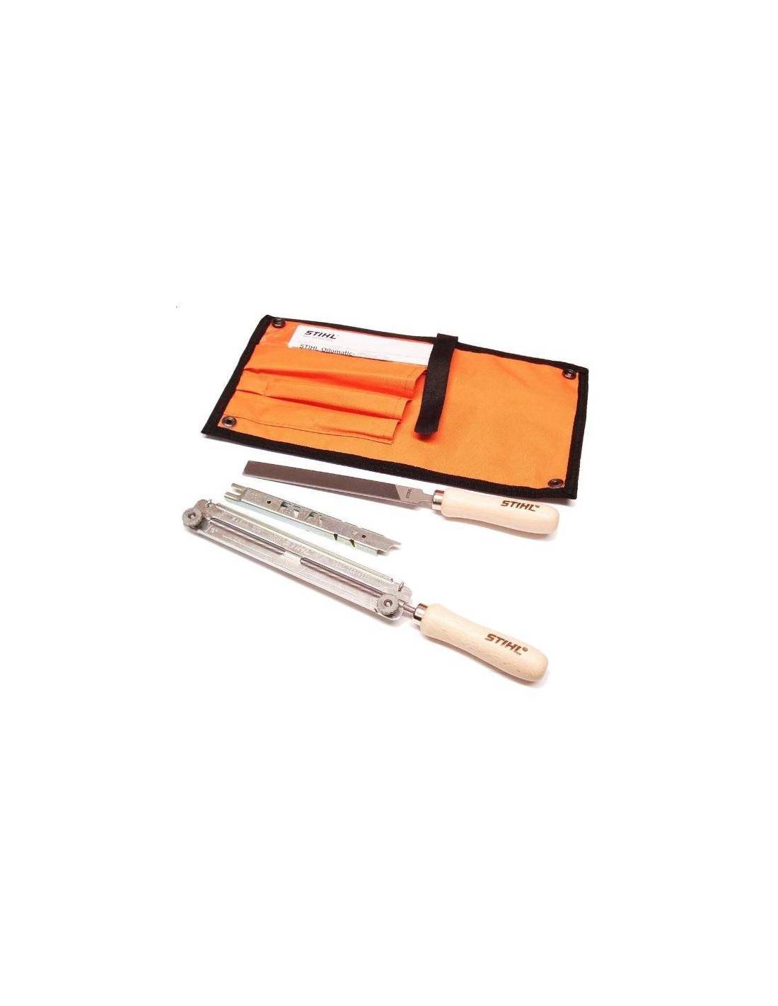 Juego de afilado STIHL para cadenas .325". Compuesto por portallima, lima redonda, lima plana y plantilla de limado. Bolsa de transporte robusta.