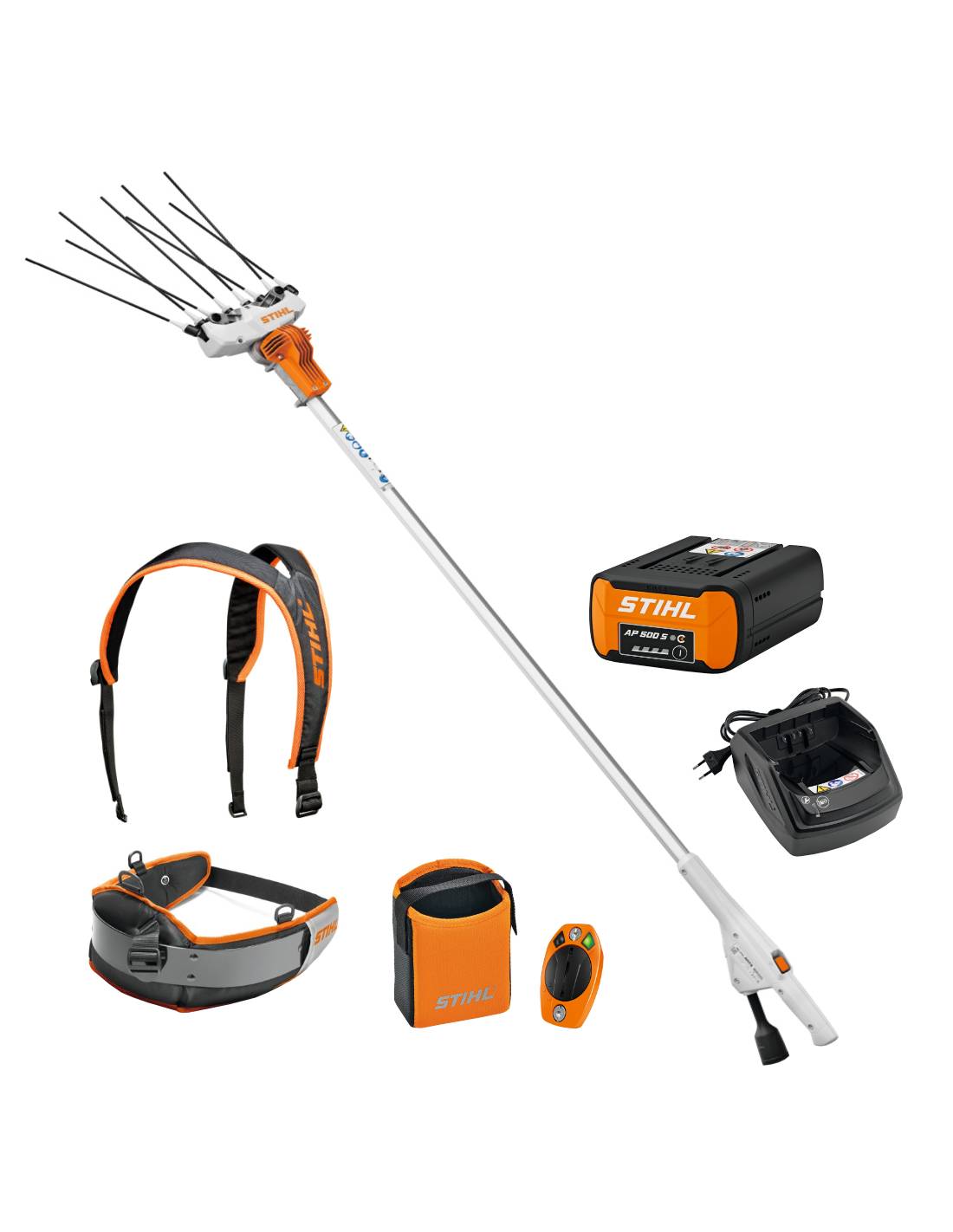 Pack completo STIHL SPA 130: vareador de batería con arnés, cable, cargador AL 101, batería AP 500 S y Smart Connector 2 A. Potencia, ligereza y conectividad para profesionales del olivar.