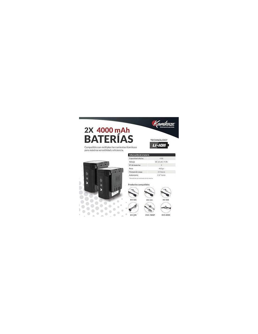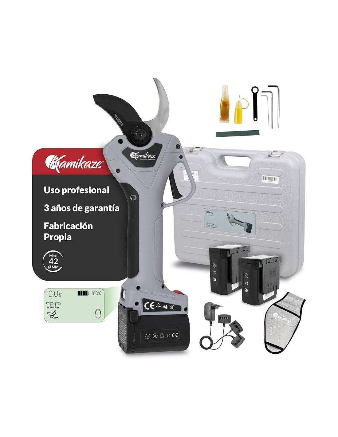 La Kamikaze KV390 es una tijera de poda eléctrica profesional diseñada para garantizar potencia, precisión y autonomía para usuarios exigentes. Su motor de alto rendimiento, junto con su cuchilla y contracuchilla de acero japonés SK5, permiten realizar cortes limpios y rápidos hasta Ø 40 mm con un desgaste mínimo.